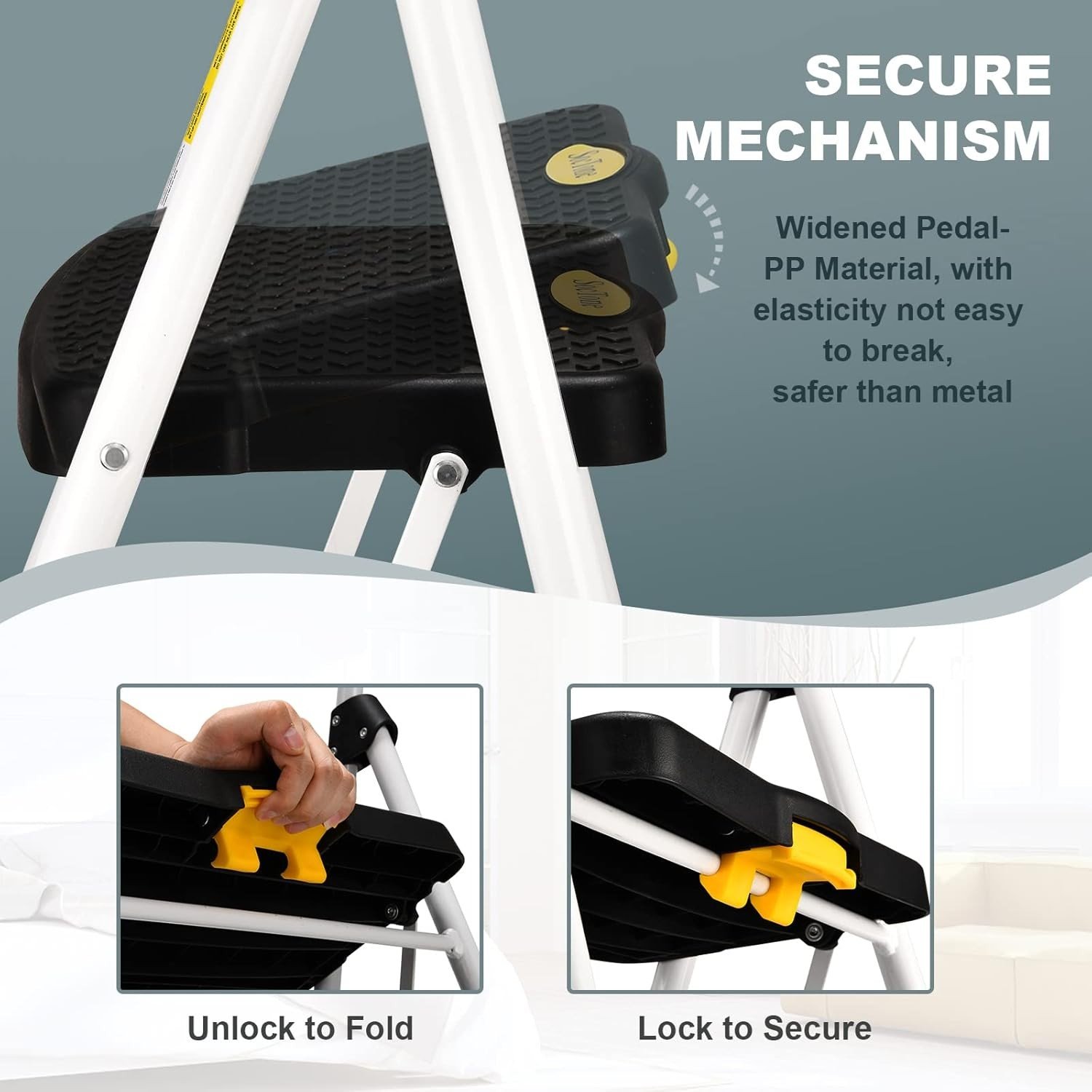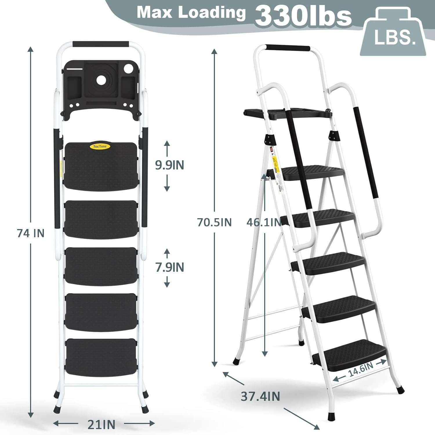 سلم 5 درجات قوي وآمن: يتحمل وزنًا يصل إلى 150 كجم، مع تصميم فولاذي متين وهيكل مدعّم.