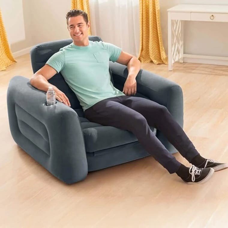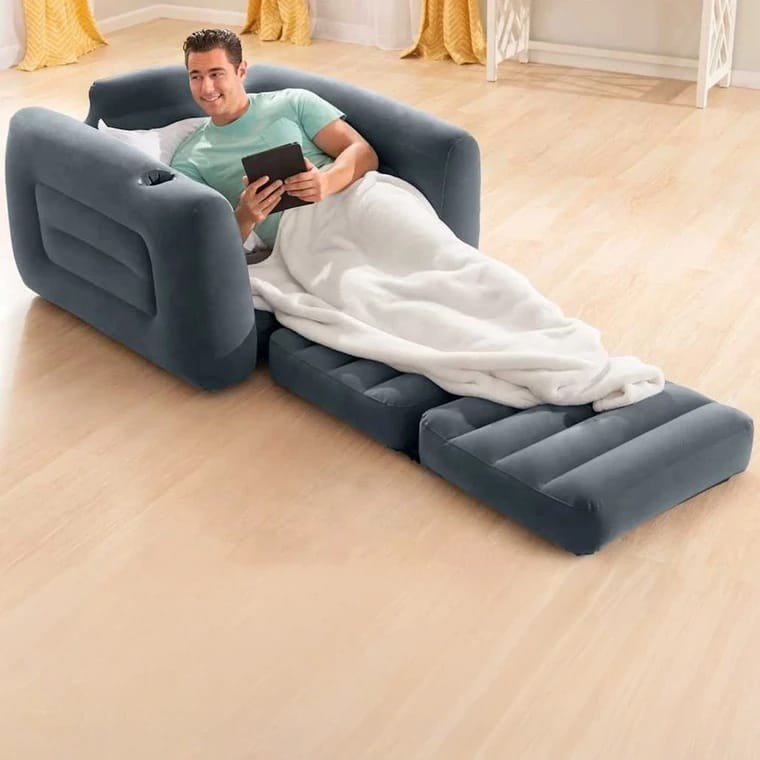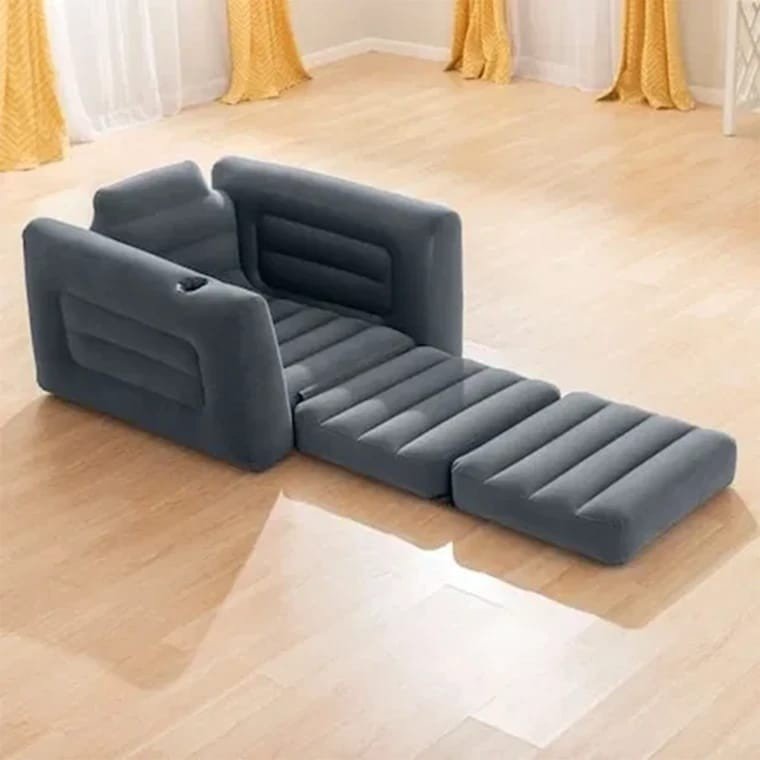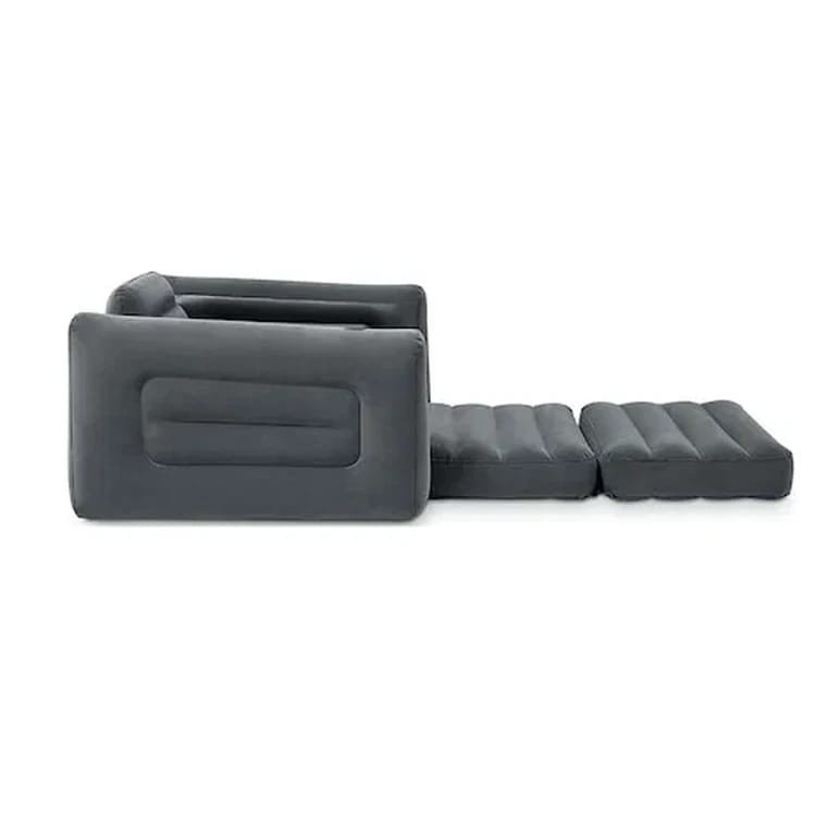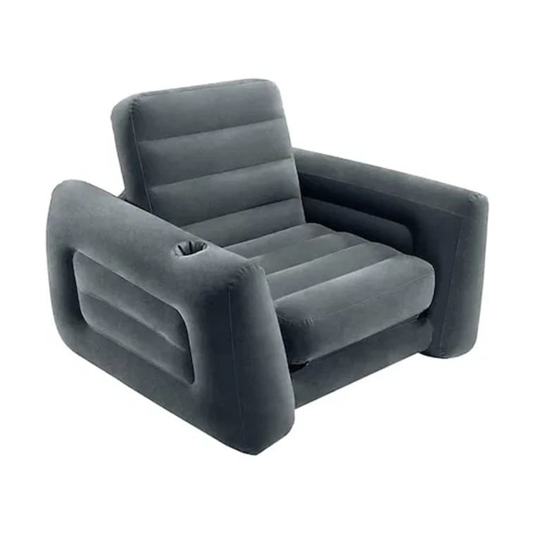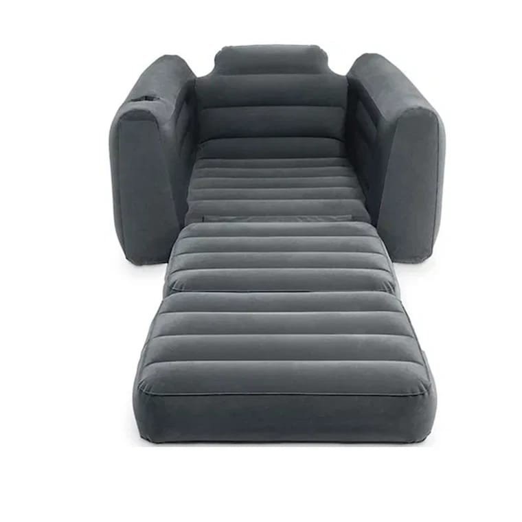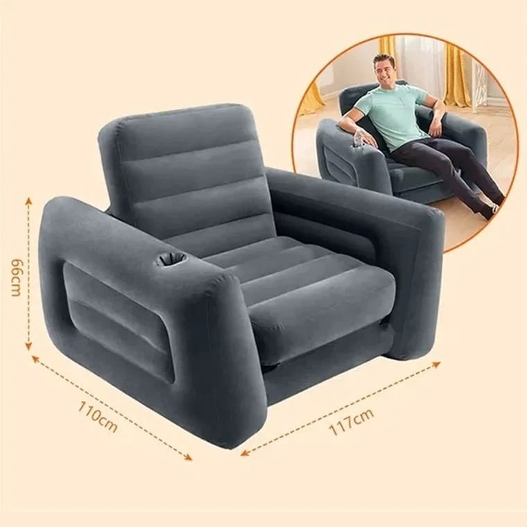 كرسي مريح يمكن تمديده ليصبح سريراً مفرداً بمقاس 117×224×66 سم، . مصنوع من PVC مع سطح مخملي ناعم يمنح إحساساً مريحاً مع مساند جانبية مريحة وحامل كوب مدمج لسهولة الاستخدام. مادة PVC بطبقة مخملية صمام 2 في 1 للتفريغ والنفخ وتخزين سهل