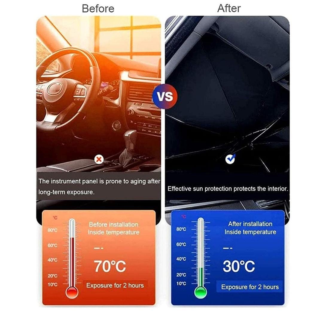 هالمظلة القابلة للطي تعزل الحرارة بشكل قوي، وتخفف درجة حرارة السيارة حتى لو كانت واقفة تحت الشمس وقت طويل، يعني تدخل سيارتك وتلقاها باردة ومريحة بدون ما تنحرق إيدك من الدركسون أو الكراسي!