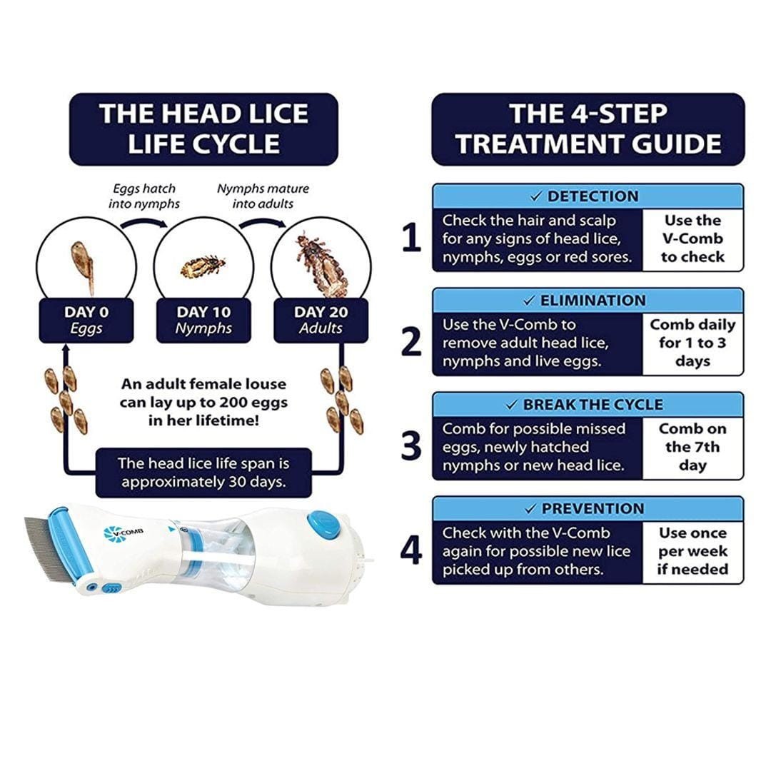 مشط V-Comb أوتوماتيكي للقضاء على قمل الرأس / قشرة الرأس V-Comb عبارة عن جهاز يشتمل على تمشيط وتنظيف بالشفط الكهربائي للقضاء على قمل الرأس وبيضه.